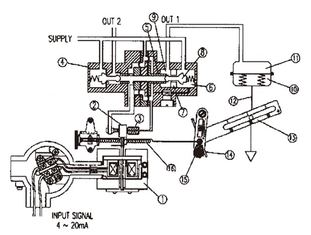 氣動閥門定位器是按力平衡原理工作的,實(shí)現(xiàn)由輸入的4~20mA電流信號控制氣動閥門由0~100%的開啟度。其工作原理如下圖。