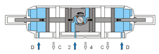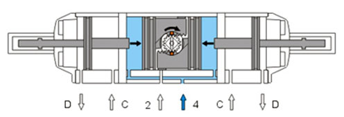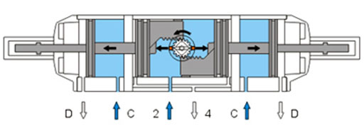 氣源壓力同時(shí)進(jìn)入2口和D口,空氣從4口和C口排出,2口作為內(nèi)部活塞移動,D口是通過輔助活塞推桿限制內(nèi)部活塞定位在預(yù)定的中間位置。